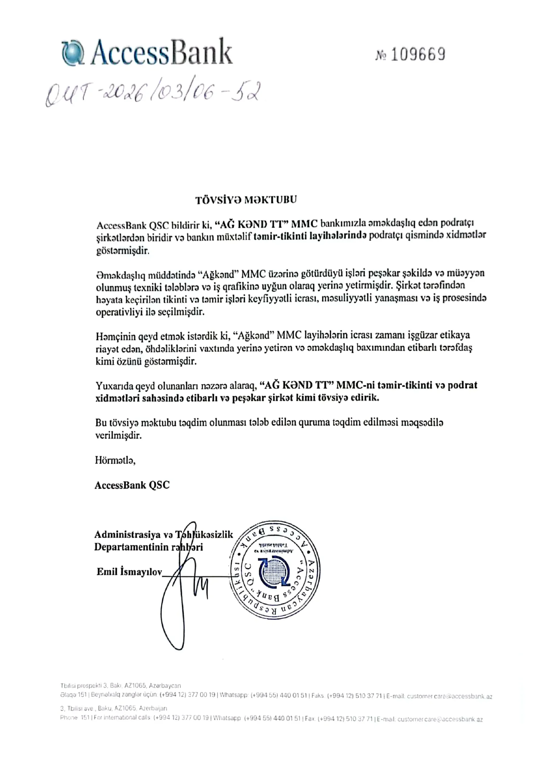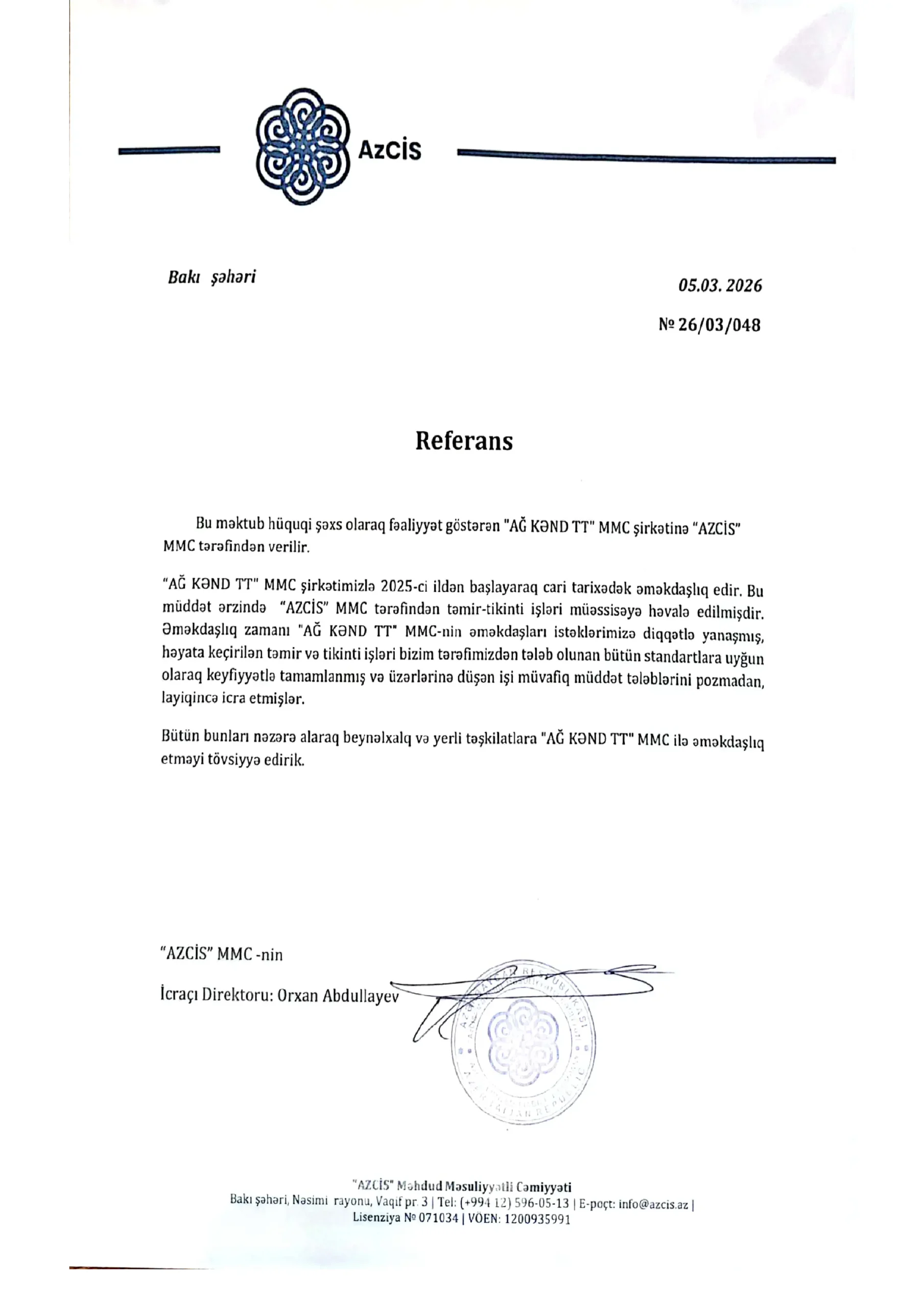 “AĞ KƏND TT” LLC has been repeatedly declared the winner of various tenders and has successfully completed all the projects in which it has participated.